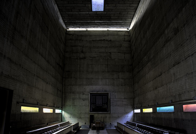 A: The patten temple was designed to showcase the tile patterns I was designing for a client. Since the pattens were supposed to feel modern, I designed the building in a way that I thought would work with the modern patterns. However, the base of the building design feels somewhat ancient Greek/Egyptian to me. The large slabs and small openings are Mediterranean in flavor, since they will block a lot of the hot, direct sun. The large opening in the roof was to let enough direct light in to show what the pattens would look like next to a large window on a sunny day. Many people who use wall patterns from the company I was working with (http://www.modulararts.com) will use artificial lights to create grazing, colored lights on these patterns. I wanted to show these types of lighting conditions as well as more direct sunlight conditions, all using the sun as my only source. This was the plan behind the design of the temple. The lighting design was inspired by Le Corbusier’s Monastery of Sainte Marie de La Tourette. I discovered the monastery, when I read an excellent piece about it in Marietta Millet’s book Light Revealing Architecture.