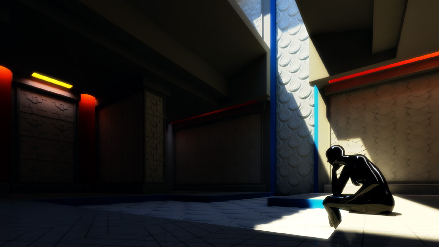 Creating strong directional lighting to bring visual depth to a scene. This is not always necessary depending on the lighting situation, but it can increase how easy it is for the player to “read” the space. I feel a lot of our scenes were visually flat, and really needed more play between light and shadows. In animation and stills this is easier, since you have a key light that will be used for that particular scene. In real-time 3d worlds, the player is moving around all the time, so a key direction that works from one set of angles will be sub-optimal for other areas in the scene. One way to make this easier is to design the scene geometry with this in mind, and allow opportunities for directional light indoors.