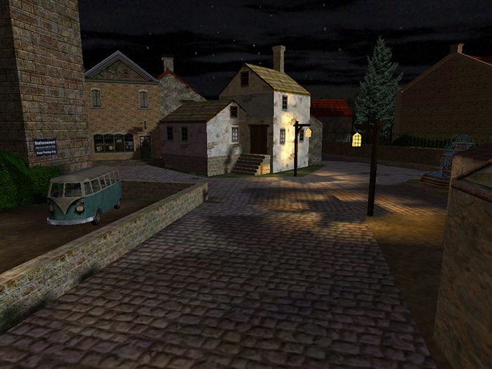 Although this is one of my more successful lighting set ups from the game, you can see a number of the flaws: The lighting does not clearly indicate what’s important to the player, the sky is darker than the tree silhouetted against it, the street lamps cast distracting shadows, and the colors are not very evocative.