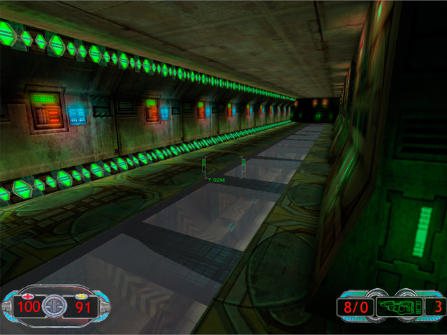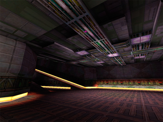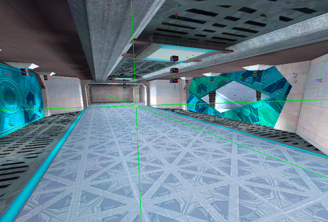 Another thing I think we did right was to have a single main texture artist for the environments. Jamie Burton painted a large majority of the textures for this project. Not only was his vision for the textures very cool, all the levels had a sense of artistic coherence from his work. As you’ll notice from some of the screenshots, the wall texture detail is pretty subdued. This is important in a first person shooter, where it’s important to be able to pick out your target from the environment. In the scenes that work the best, we put most of the detail into the floor and ceiling.