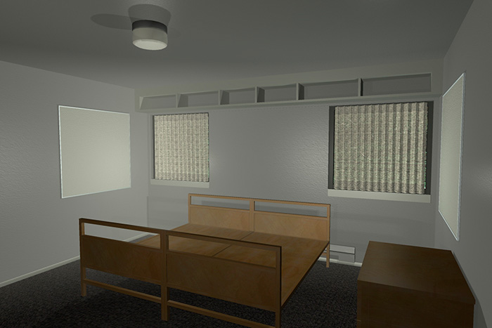 I had an issue where there was too much contrast in the image from the dark areas in the room on the side of the window wall. I lightened them up by adding another set of physical sky portals in front of the curtains. This gave a better simulation of light coming through the curtains and brought out the room’s textures more. I reduced contrast in the image further, by adjusting the tone mapping to smooth out the bright tones and raise the mid-tones.