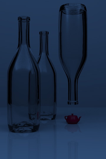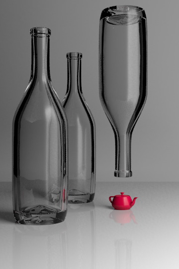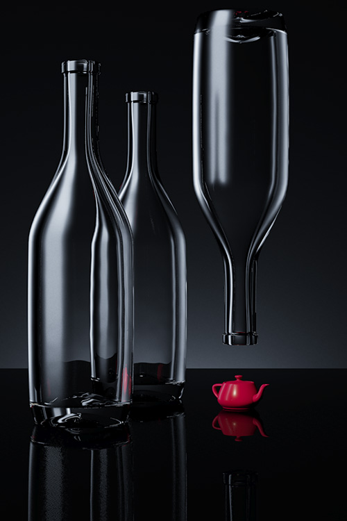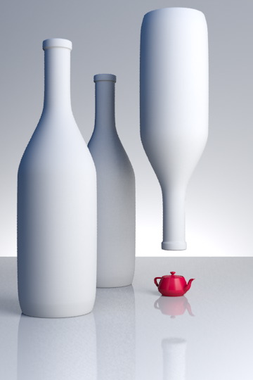 You can see the reflection of the large area light square in the angled parts of the bottle. The reflection of a large light is good for showing off the contours of curved objects. As a teaser, here’s the scene with a diffuse material on the bottles:
