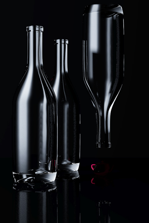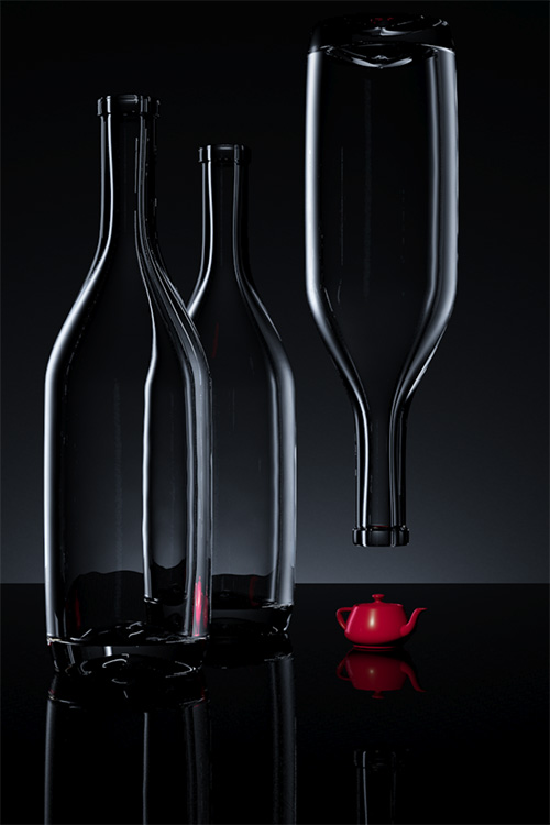 There are three glass bottles sitting on a white, reflective surface. The background is a matte while. There are three lights in the scene. A softbox key light about 45 degrees to camera right, a “sky” fill light above the camera, angled down to the scene and a background light. As you can see, the “table” surface and the background are not much longer than the total scene. My first inclination when creating this image was to use a wide angle lens. I knew that the bottles needed to reflect the blackness of the environment background, and that the wider the view, the more angles I’d see off the bottle. The problem I ran into was with a wide angle view, I needed to have a very long background plane to cover the whole camera view. The background plane was so large, it obscured the dark environment that I wanted to use to define the edges of the glass. I slowly brought in the angle of view and the background plane, until I got just the right amount of black environment reflected. At this point, I was only working with the background light, since I was only interested in illuminating the surface behind the glass, so I could tune the reflections of the black environment.