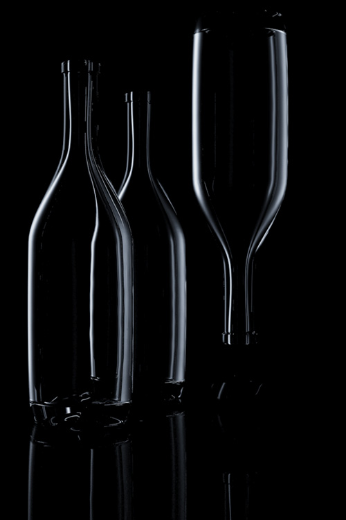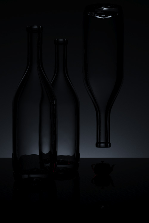 The first exercise I took on was that of lighting clear glass bottles on a white “field” or background. This presents a bit of a paradoxical problem. Most people understand that transparent, reflective materials look like what is behind them and what is around them. Lighting clear glass on a white background might seem like an impossibility, since in the white background there is very little to reflect or refract.