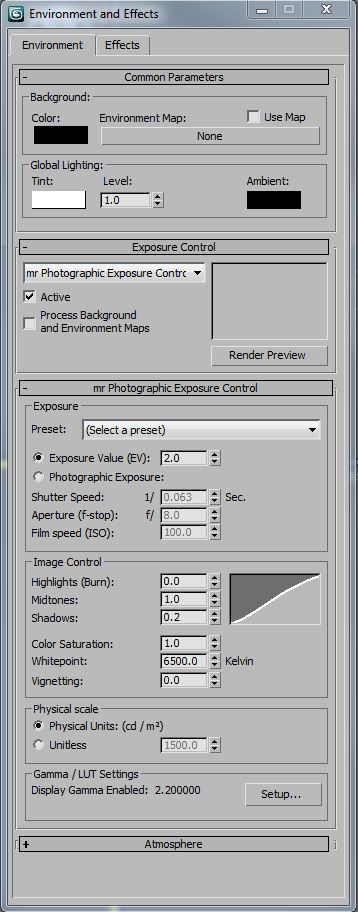 I used a night time interior level of exposure control (2 EV), which I should have used in both studio scenes. It’s important to set the exposure property, so that your lighting will behave realistically when global illumination is calculated. In these particular scenes, almost all of the reflections are direct instead of diffuse indirect, so it’s less important to match exposure and light values. However, it’s a good practice to specify real-world light and exposure values, in the same way it’s important to model at real-world scale -Your renderings will be more predictable.