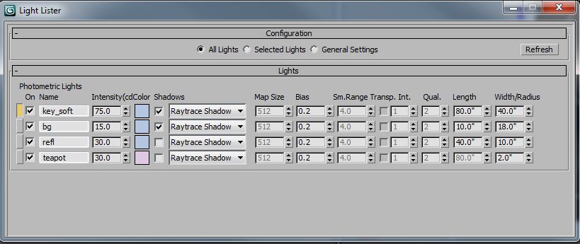 The edge reflection (refl) light could almost be a white card. It mostly just needs enough illumination that it reads white in a reflection, which is different than actually casting diffuse light into the scene. The key light (key_soft) has to be a lot brighter to keep up with the edge reflection values.