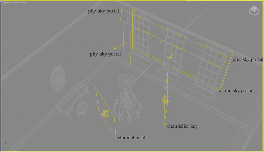 The sky part of the daylight system is not used directly, but my custom sky material is assigned to a large sky portal outside the windows. I found that the light from the custom sky was too pink, so I added another sky portal behind the first, and assigned the physical sky material to it. That allowed me to mix the physical sky with my custom sky to get the balance of warm and cool colors I was looking for. This could have also been created by mixing the mr physical sky with the image sky in a composite map, but I felt like having the sky controls split into two objects gave me a more intuitive, flexible control system.