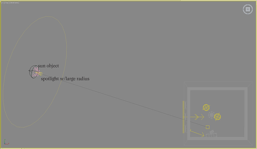 Working with the daylight system was a bit of a challenge in this scene, because the color of the sun is not directly controllable. However, I needed the soft shadows and parallel light to simulate sun coming through partial cloud cover. To create the appropriate pink colored sun, I turned down the intensity of the sun object and added a very bright photometric spotlight with a narrow cone angle. The shadows from the windows didn’t match up exactly between the two lights, so I softened the spot light shadows to blend in better.